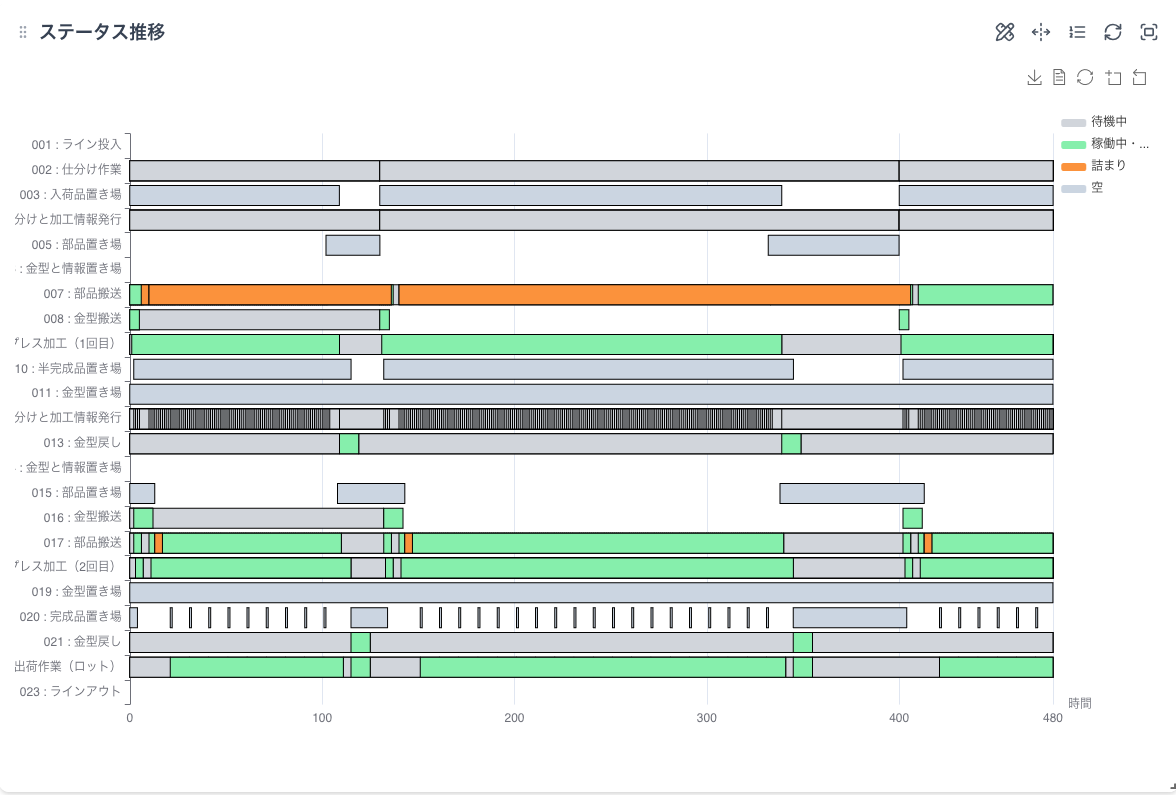 といった、より実務に即した複雑な段取り要件にも対応可能です。生産効率の改善や、現場設備の負荷検証にも活用可能です。