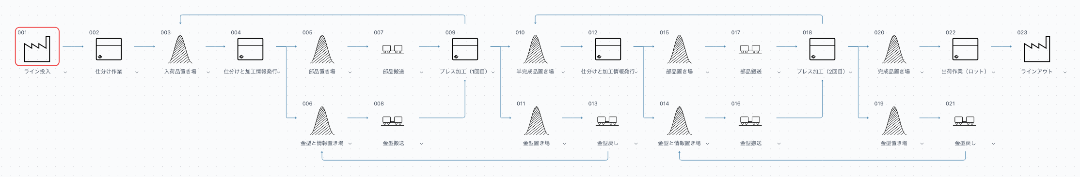 assimeeでは、実際の製造プロセスをモデル化したシミュレーションや、既存のVSM(バリューストリームマップ、物と情報の流れ図)を活用した直接的なシミュレーションが可能です。これにより、製造プロセスの「見える化」を実現し、潜在的な課題を明確にすることができます。製造プロセスのデジタル化や課題解決にお悩みの方は、ぜひお気軽にお問い合わせください。