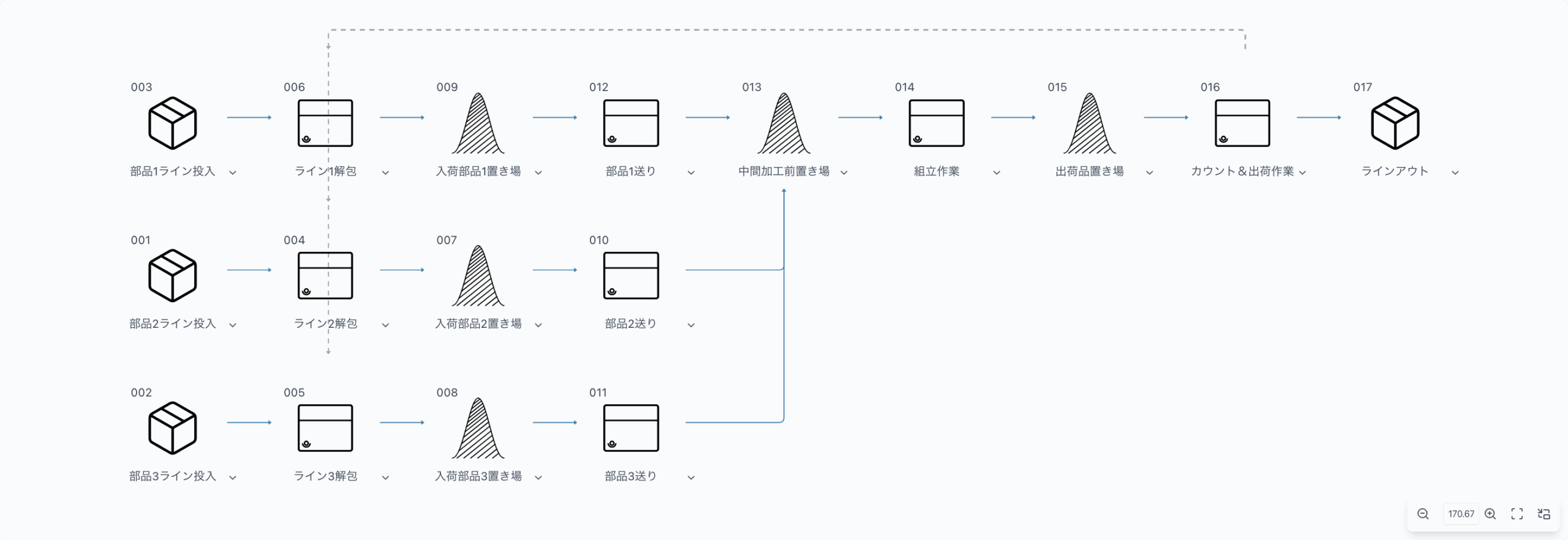 このように、ロットでの出荷のタイミング(引き取りかんばんの回収)をトリガーとして複数の部品の供給が発生する構成をモデル化しています。