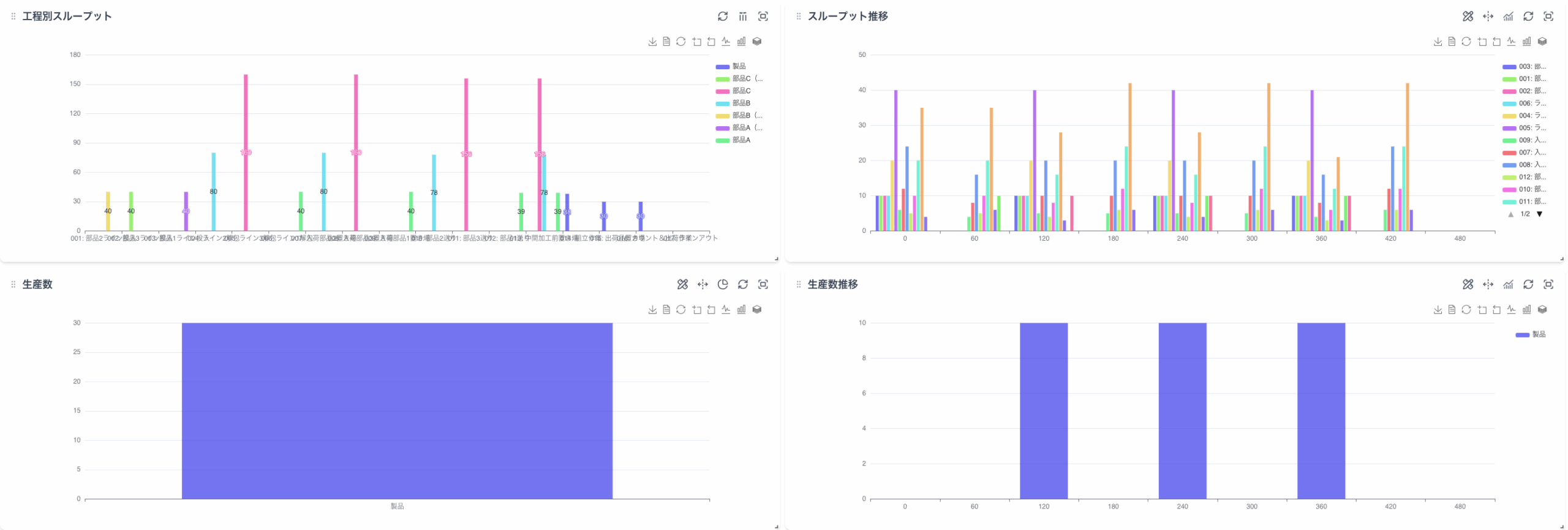 モデルの作成と設定が終了したら、シミュレーションを480分間に設定し実行します。シミュレーションが終了したら、結果をグラフで確認します。まず、生産数と各工程のスループットです。