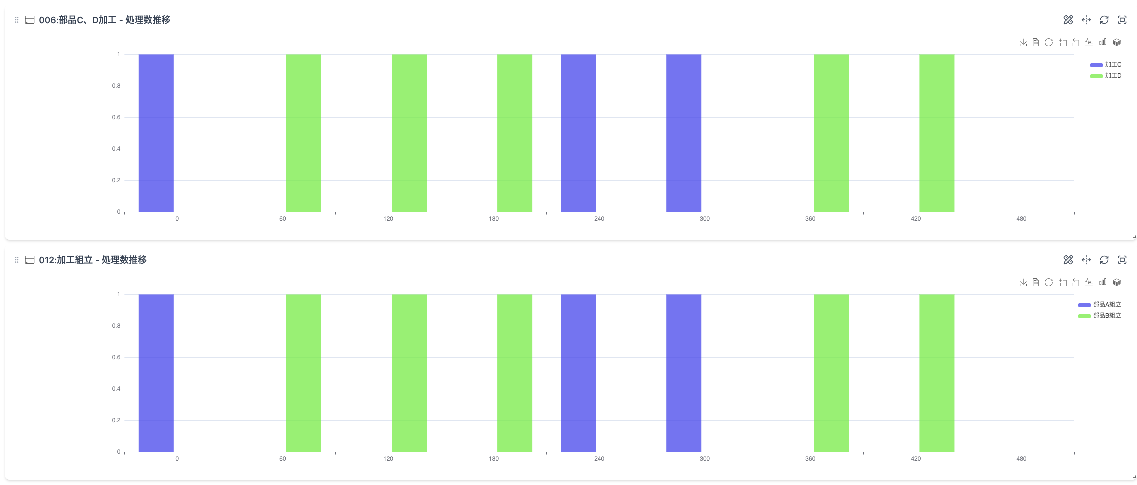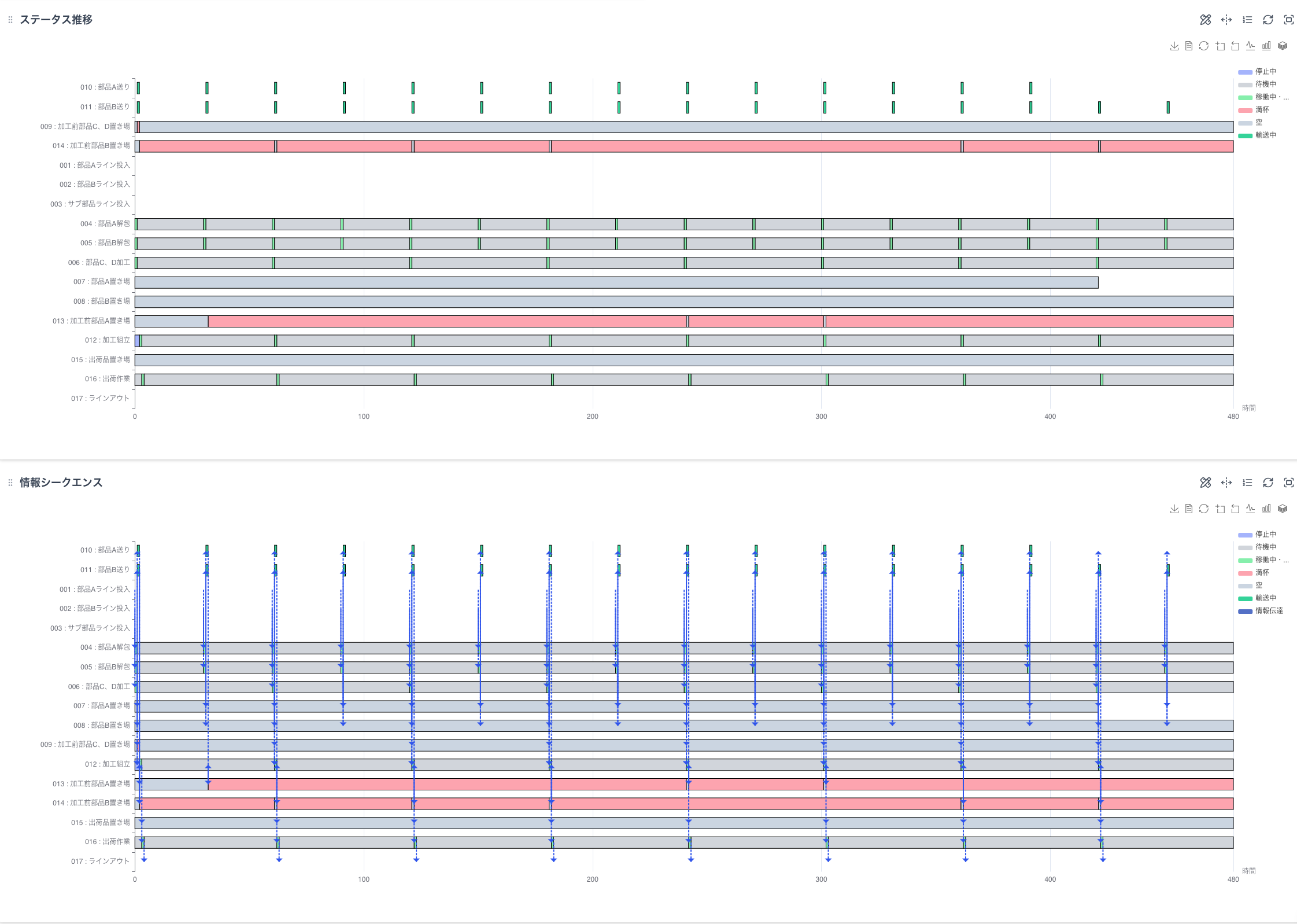 生産能力の確認だけでなく、部品送り工程がロックされないように部品供給を調整するなど、工程の改善点を見つけることができます。