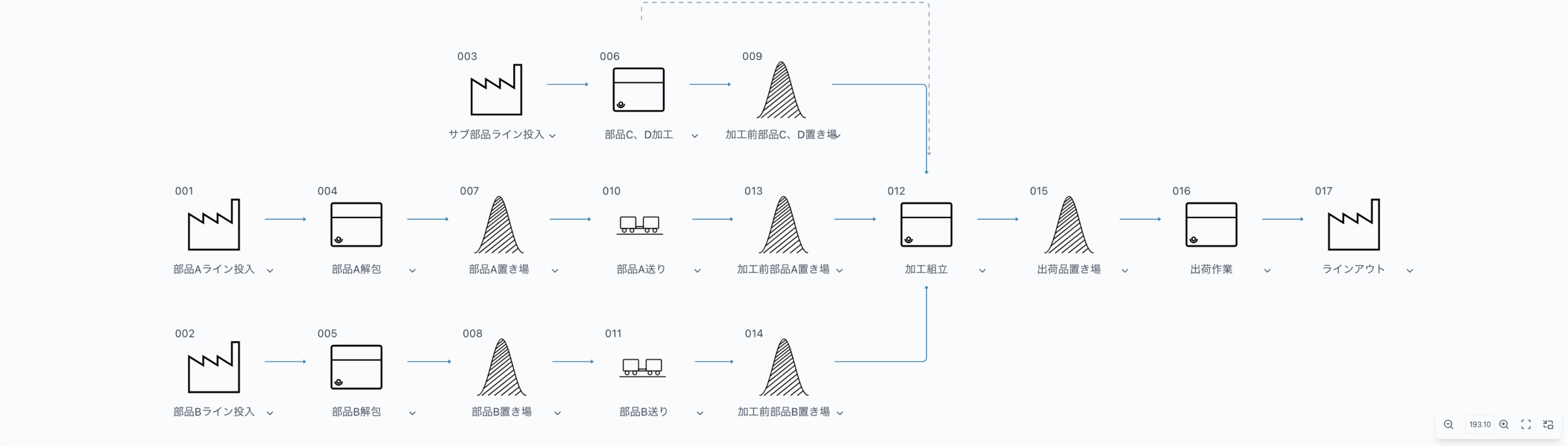 assimeeでは、実際の製造プロセスをモデル化しシミュレーションや、既存のVSM(バリューストリームマップ、物と情報の流れ図)を活用した直接的なシミュレーションが可能です。これにより、製造プロセスの「見える化」を実現し、潜在的な課題を明確にすることができます。製造プロセスのデジタル化や課題解決にお悩みの方は、ぜひお気軽にお問い合わせください。