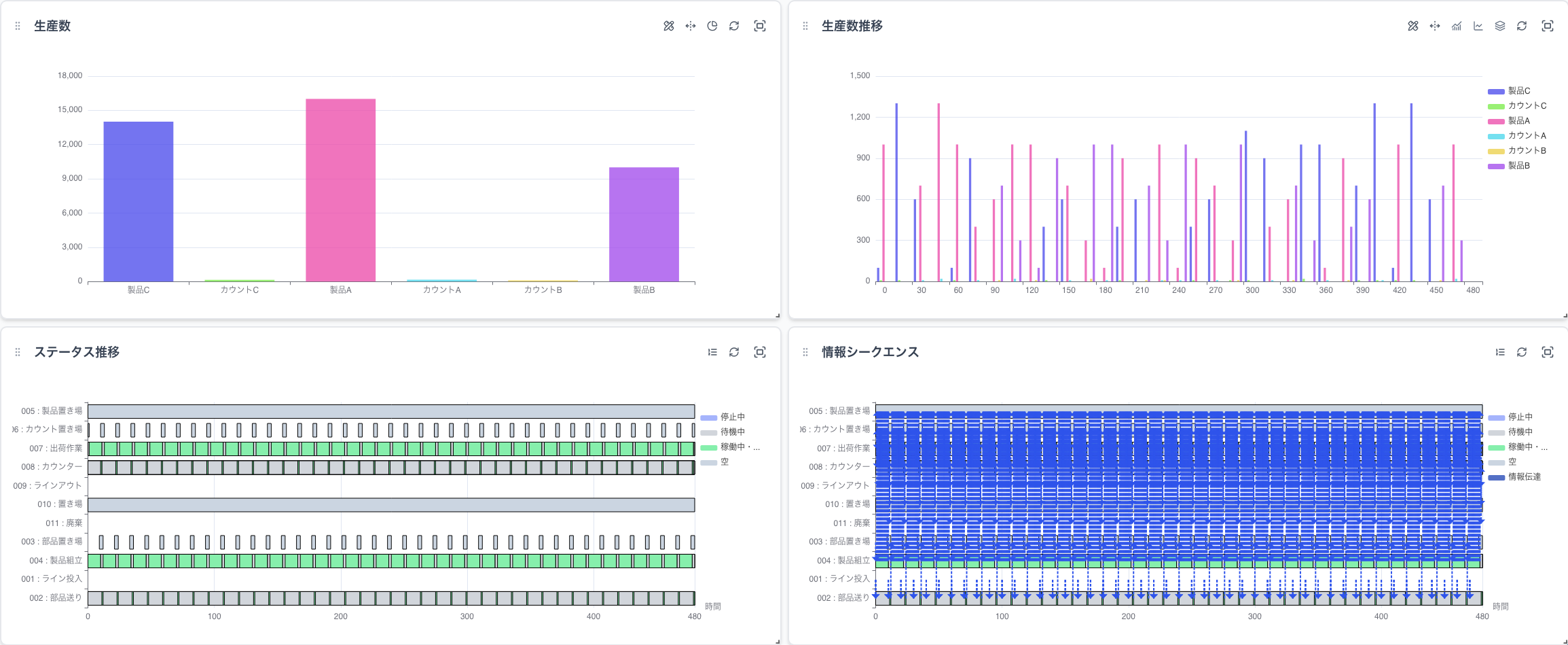 ほぼ同等のシミュレーション結果が得られました。ステータス推移を見ると生産ラインがほぼ同じ挙動となっていることがわかります。