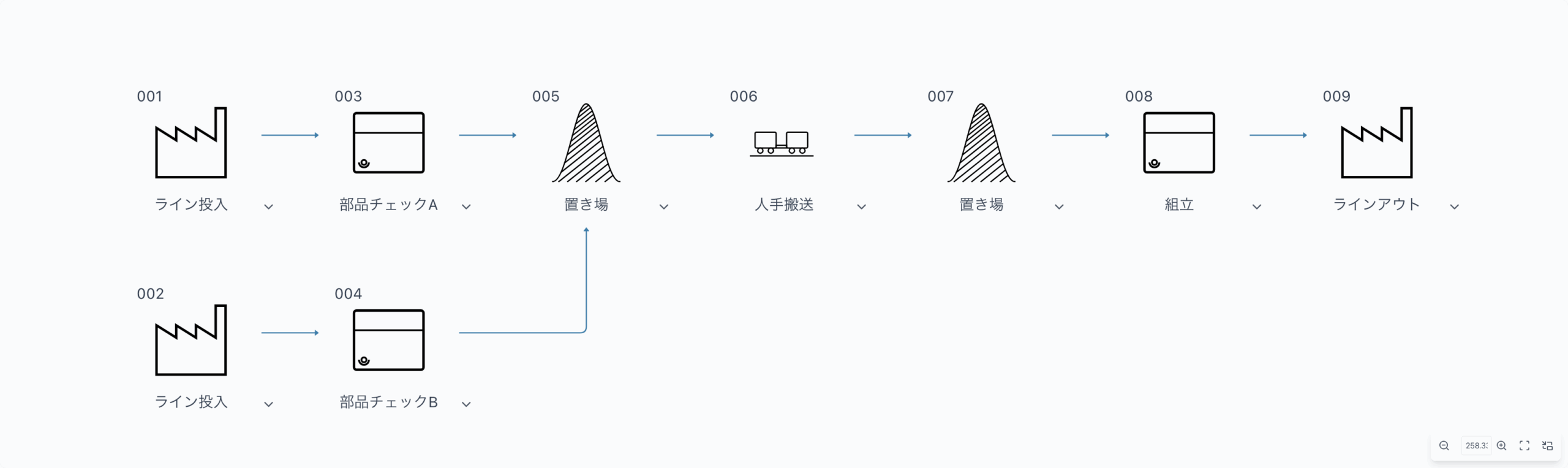 assimeeでは、実際の製造プロセスをモデル化しシミュレーションや、既存のVSM(バリューストリームマップ、物と情報の流れ図)を活用した直接的なシミュレーションが可能です。これにより、製造プロセスの「見える化」を実現し、潜在的な課題を明確にすることができます。製造プロセスのデジタル化や課題解決にお悩みの方は、ぜひお気軽にお問い合わせください。