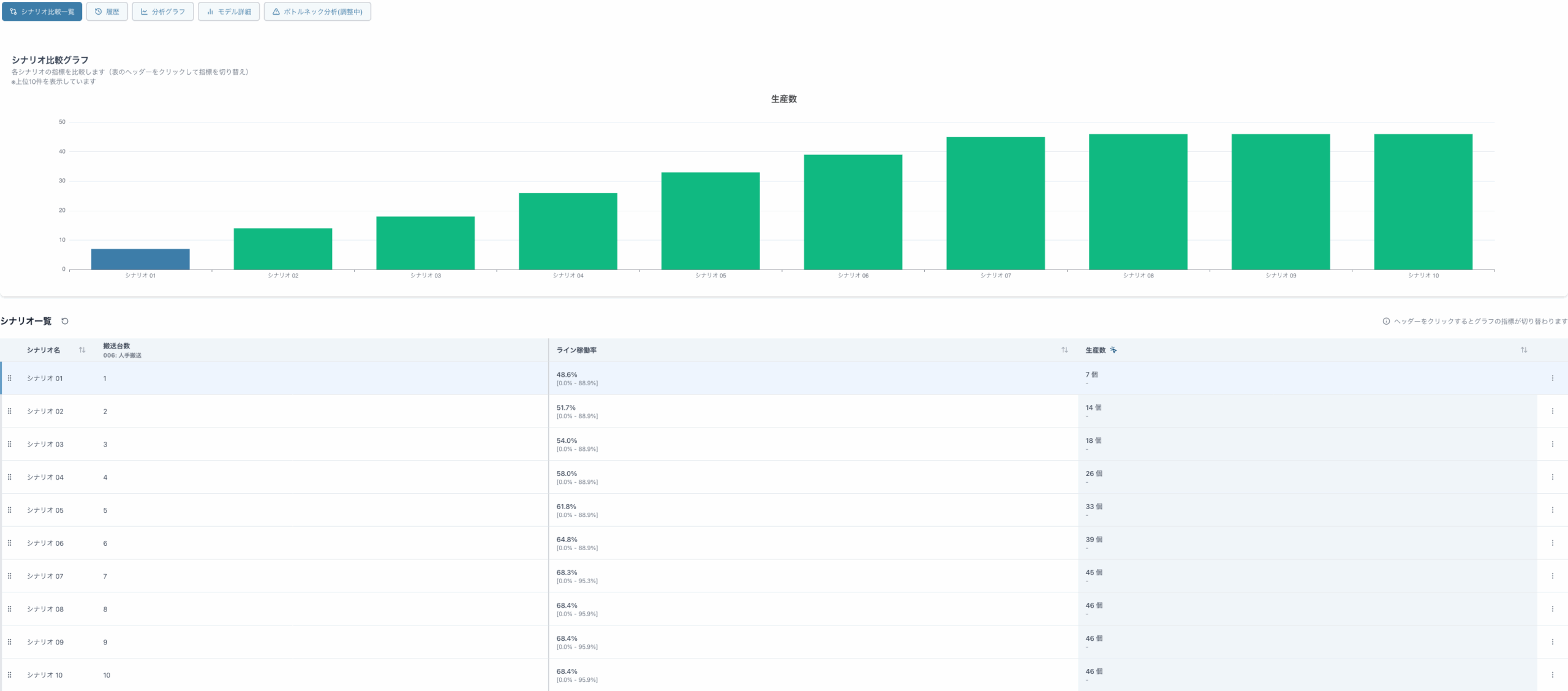 480分間のシミュレーションを実行すると、先ほど作成した10通りのシナリオの結果が一覧で表示されます。生産数に注目して結果を確認すると、以下の傾向が確認できました。
