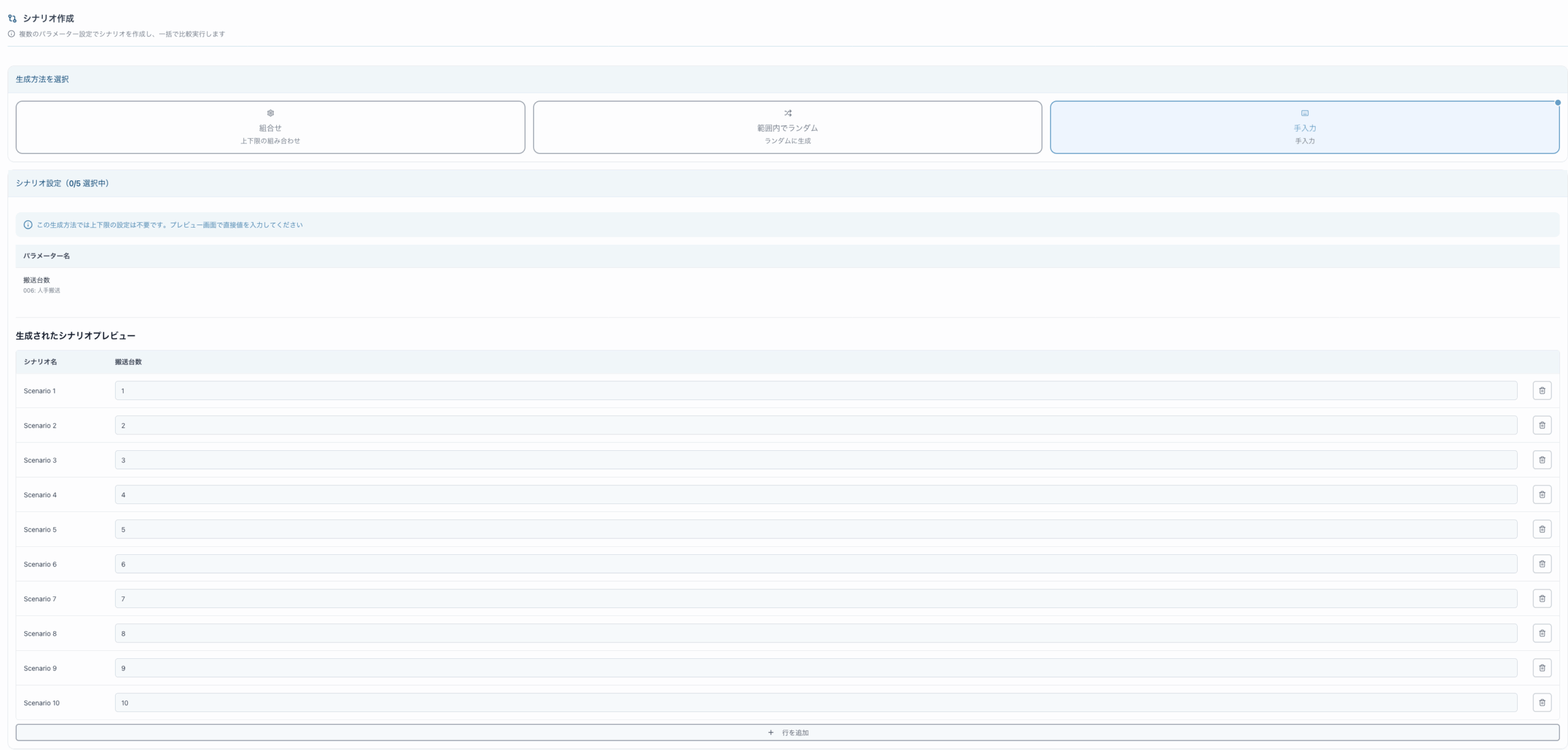 比較シナリオの設定画面は以下の通りです。今回は人員数を1人から10人の間で変化させ、10通りのシナリオを作成しました。