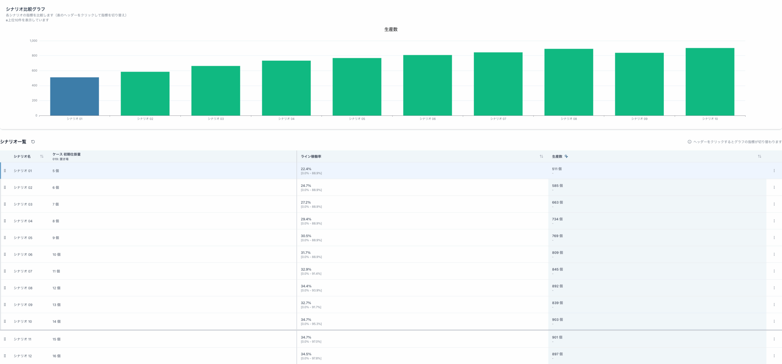 こうした課題に対して、assimeeのシナリオ比較機能を活用することで、ケース数を変化させた場合の生産量や稼働状況を一覧で比較し、最適なケース数を定量的に判断することが可能になります。本記事では、コンベア搬送モデルを作って、最適な出荷効率となるケース数をシナリオ比較機能で検証する方法を解説します。