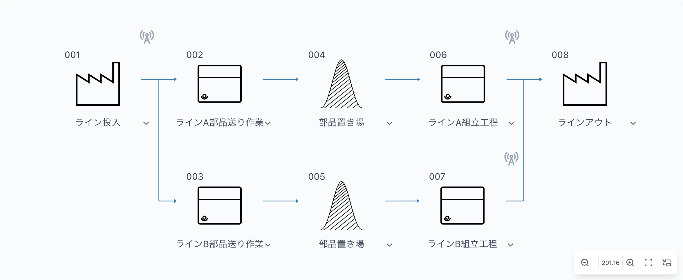 今回のモデルは、同一仕様の生産ラインを2本(ラインA/ラインB)用意し、交互に稼働させる構成です。モデルは以下の通りとなります。