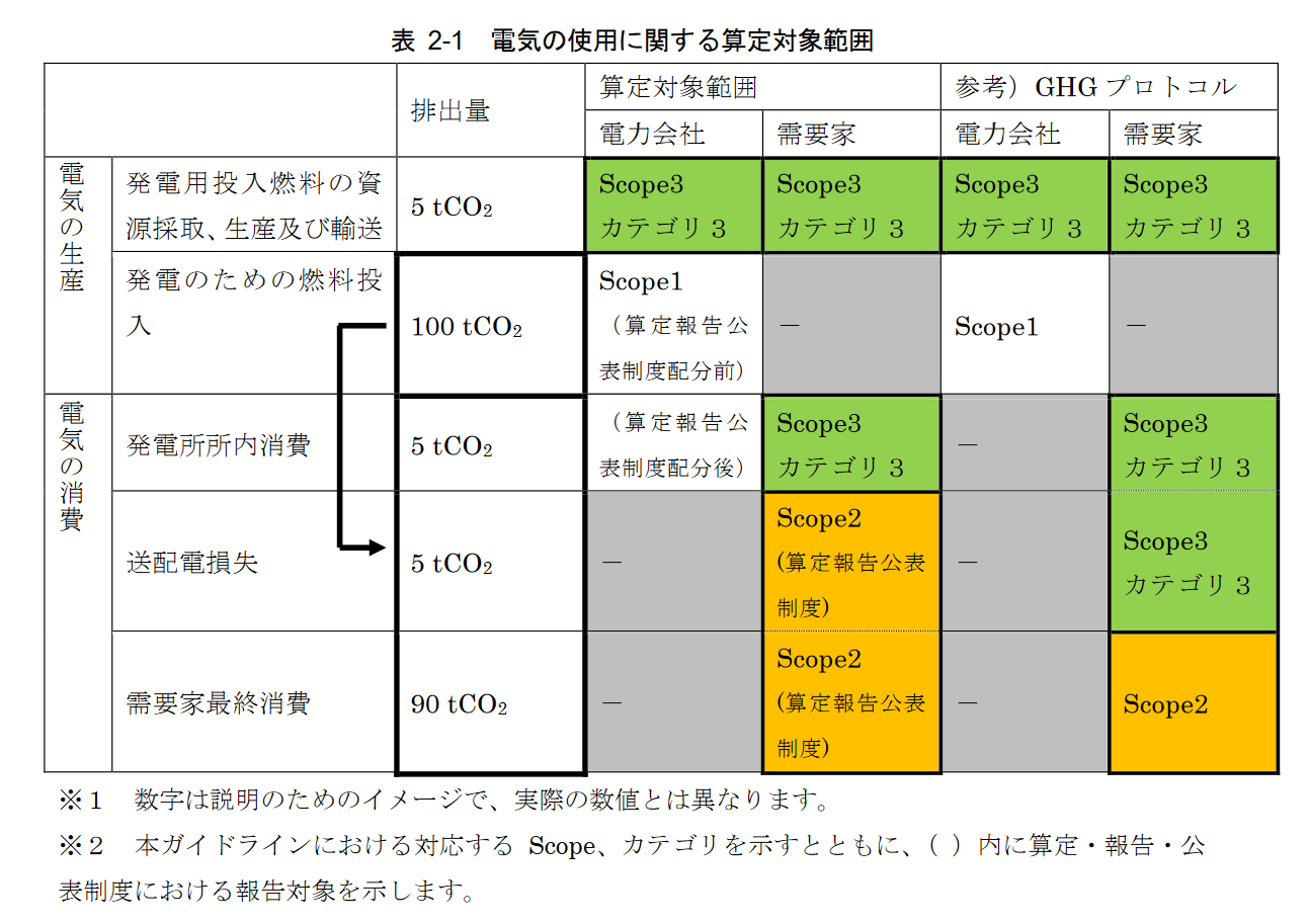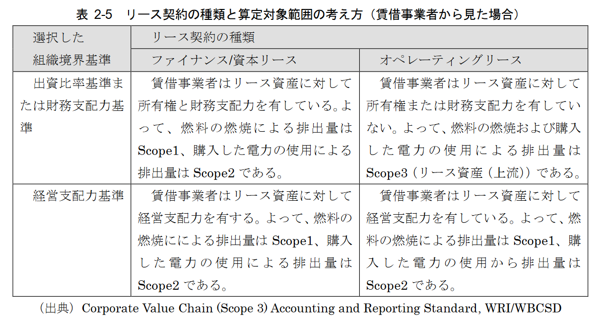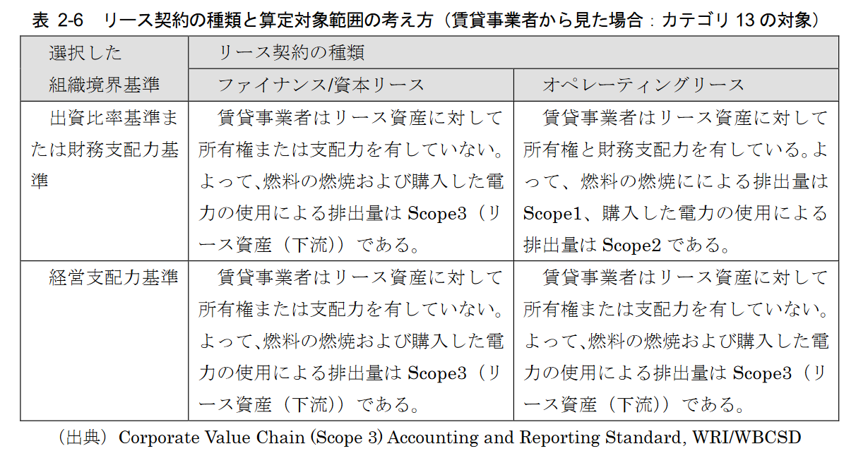 *ただし、算定・報告・公表制度では、自社が利用するリース資産の操業に伴う排出は全て算定対象となっているため、算定・報告・公表制度をもとに算定した結果を利用する場合はリース資産についてはScope1、2での算定対象に含めてください。一方で、算定・報告・公表制度で対象に含まれない短期リースの車両などのリース資産については、以下の考え方(表)に基づき算定してください。