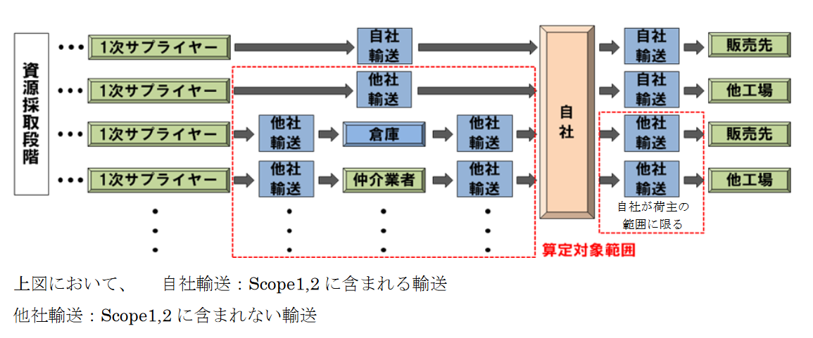 ただし、自家物流や自社施設での排出はカテゴリ3ではなくScope1やScope2 として算定します。図で示すと自社および他社の輸送と算定範囲の関係は以下のようになります。