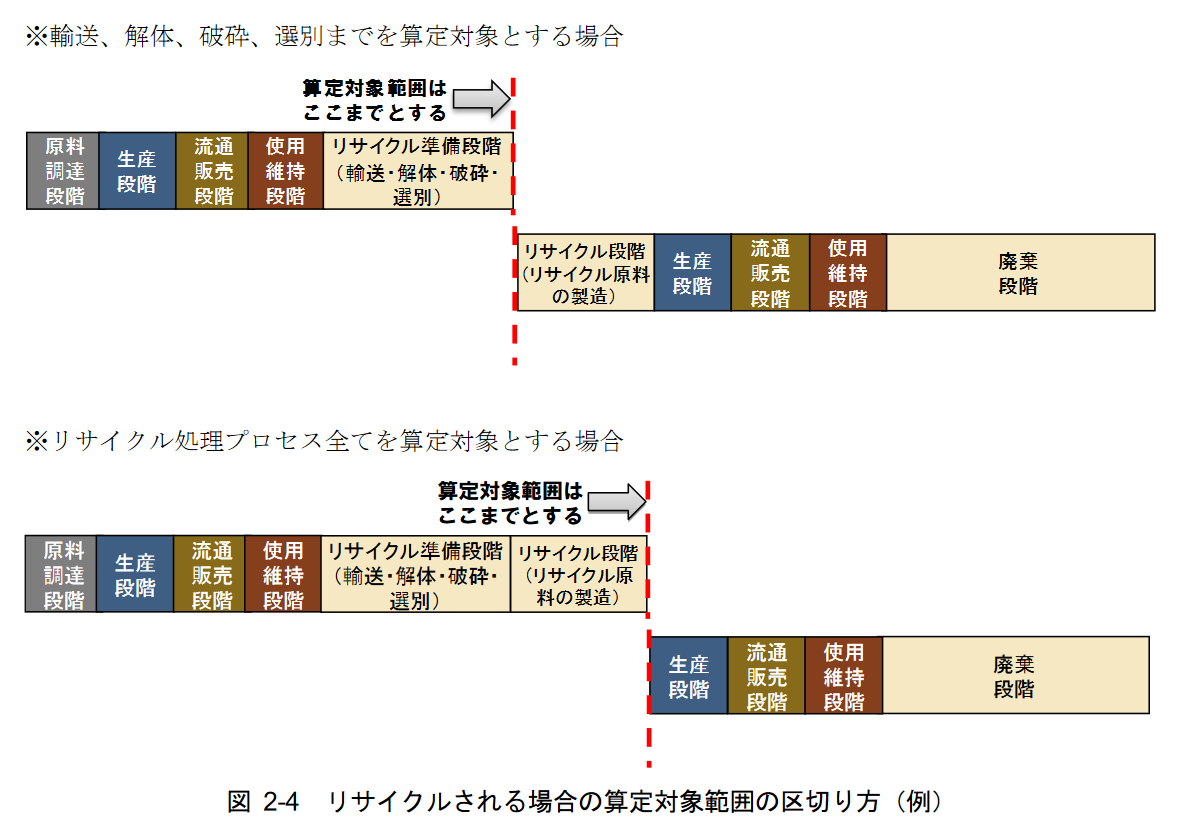 廃棄物のリサイクルを行う場合は、リサイクルされ資源化された廃棄物の行先全てを算定するのは不可能なため一定の範囲で区切る必要がありますが、特定の方法はありません。例としてはリサイクルする廃物を処理業者まで輸送し、解体・破砕・選別のプロセスまでとする方法とリサイクル原料の生産までを範囲とする方法があります。