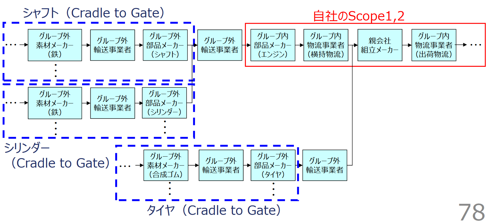 *Cradle to GateとはLCA(ライフサイクルアセスメント)において、いわゆるサプライヤーからの部品調達のことを指しており、原材料採取、原材料の輸送そして製造工程までの環境負荷を評価対象とするが、製品の使用や廃棄は考慮しないということを意味しています。この他、Gate to Gate(製品の製造工程のみが対象)やCradle to Grave(原材料の採取から廃棄までの全てが対象)などの範囲の分け方があります。