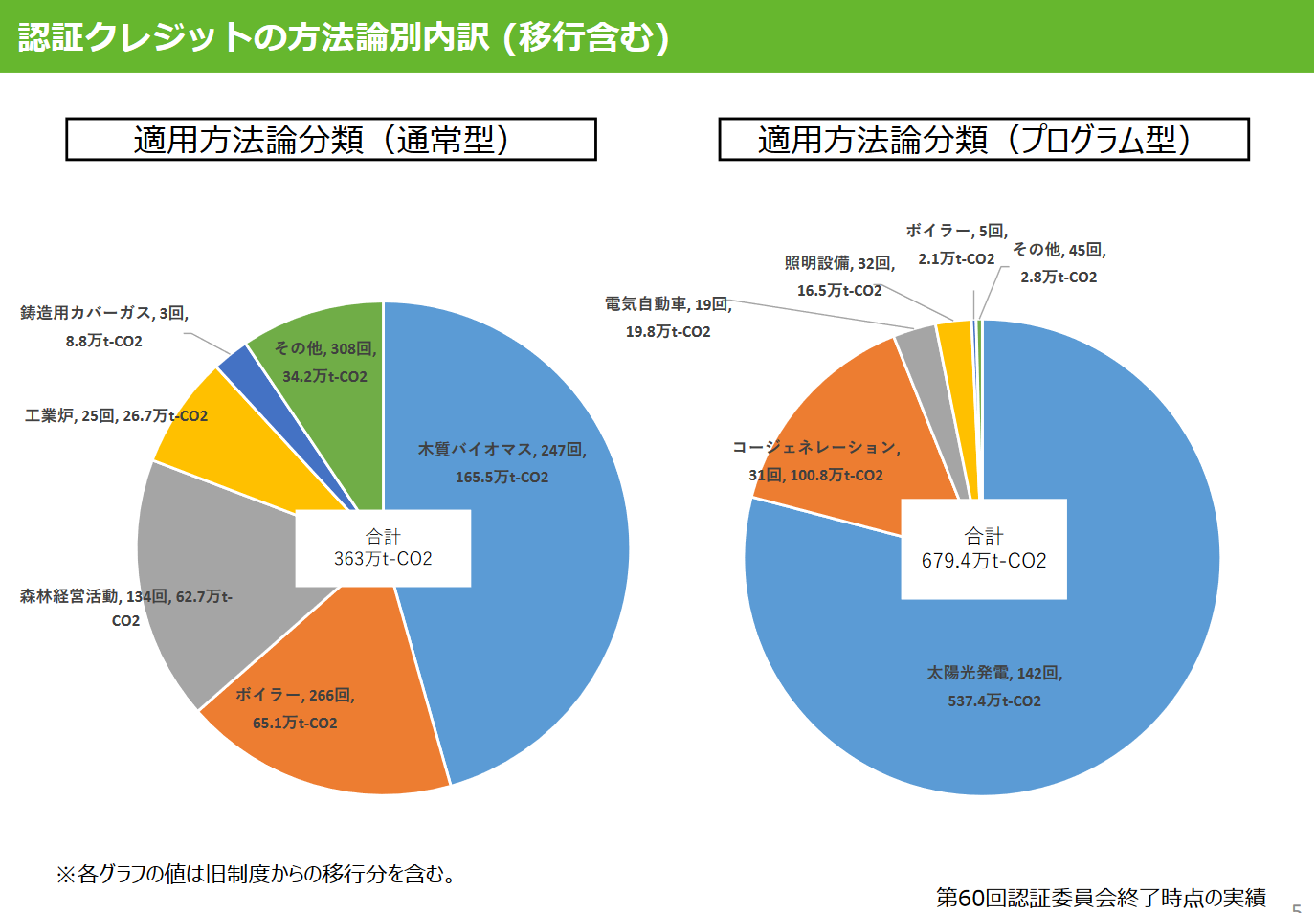また、方法論として2024年7月の時点で71の方法が承認されていて、利用可能となっています。ここでいう、方法論とは、温室効果ガスを削減する技術や方法ごとに排出削減算定方法やモニタリング方法等を規定したものとなっており、 内訳としては省エネルギー等43、再生可能エネルギー11、工業プロセス5、農業6、廃棄物3、森林3となっています(詳細は資料)。以下の図はプロジェクト別、方法論別の削減量を示しています。