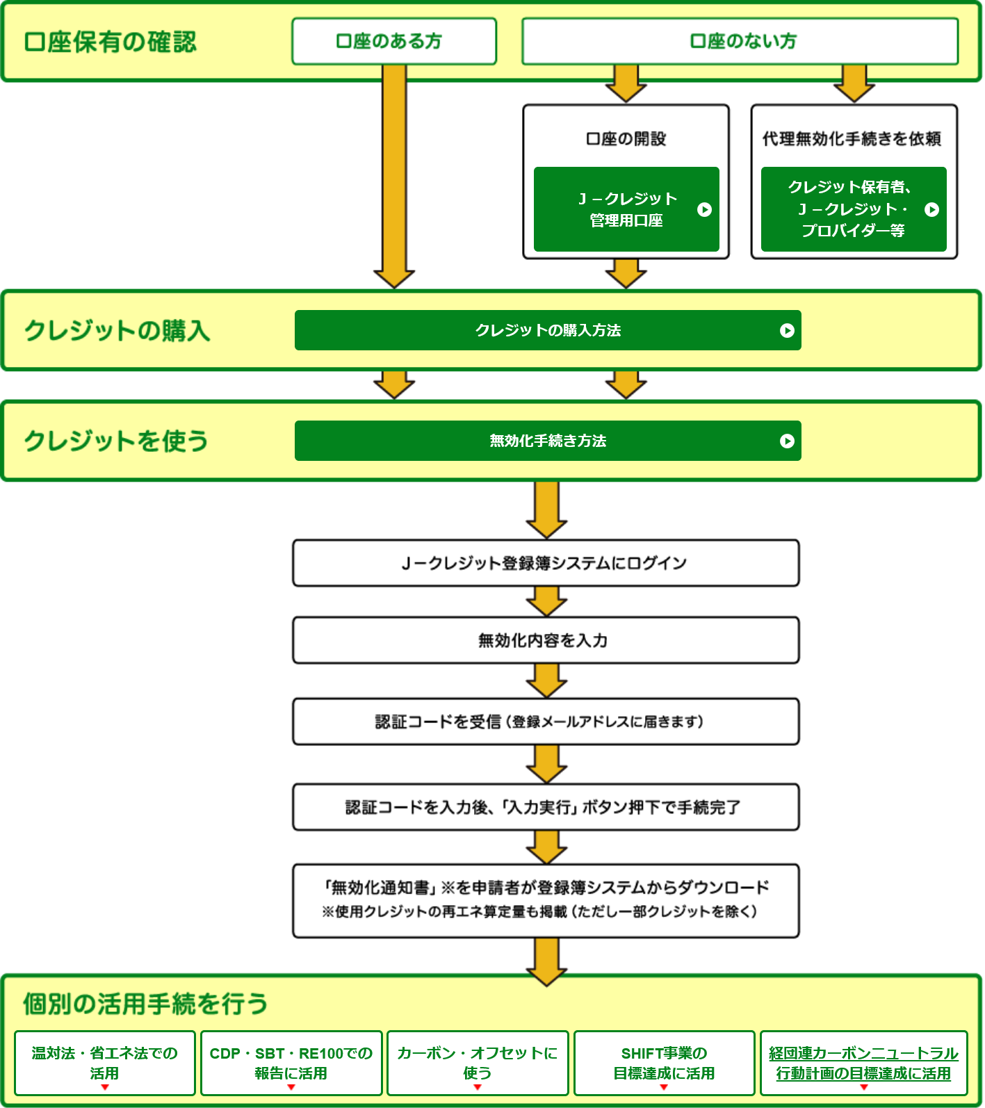 購入したり認証を受けたJ-クレジットを使う場合、どんな活用目的であっても口座にあるJ-クレジットをJ-クレジット登録簿システムで「無効化」を行う必要があります。無効化とは、一度使われたJ-クレジットが再利用や再販売をされないようにするための手続きのことです。以下の図はJ-クレジット制度のHPに掲載されている活用手続きの図となります。J-クレジットの口座を保有していない場合は、口座を開設する以外に仲介業者を通じて販売、購入、無効化などを行うことが可能です。なお一旦無効化したJ-クレジットに対して修正や取消は出来ないので注意が必要です。