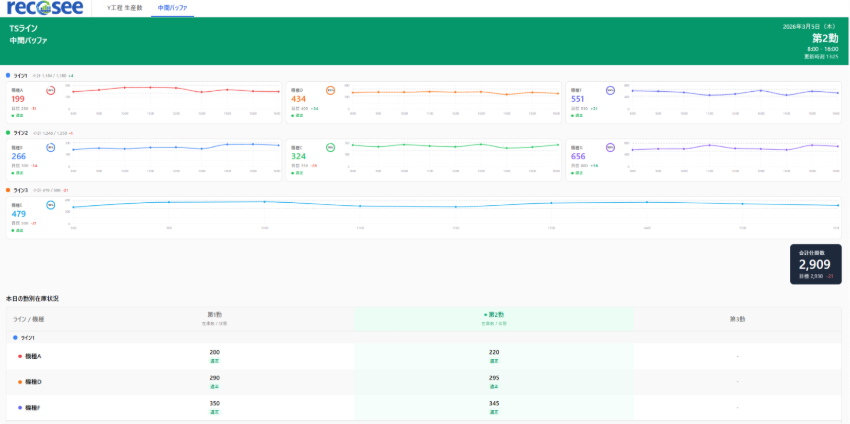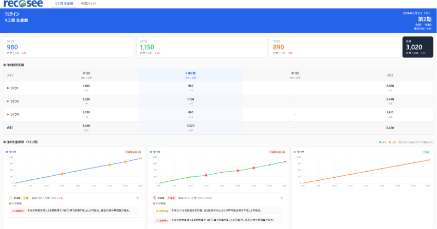 ビットクォーク株式会社が提供する「recosee(リコシー)」は、生産実績や在庫量に加え、「どの工程で」「いつ」「どのような事象が発生したのか」といった工程上の出来事を工程単位で整理・可視化します。さらに、AIを活用して計画との差異や時間当たり出来高が変化した要因を推定することで、現場での要因推定の切り口を提案します。これらの機能は、例えば、製造現場の大型モニター上に常時表示することで、関係者が同じ指標・同じ画面を見ながら現状把握を行い、次の行動を判断しやすい環境づくりを支援します。